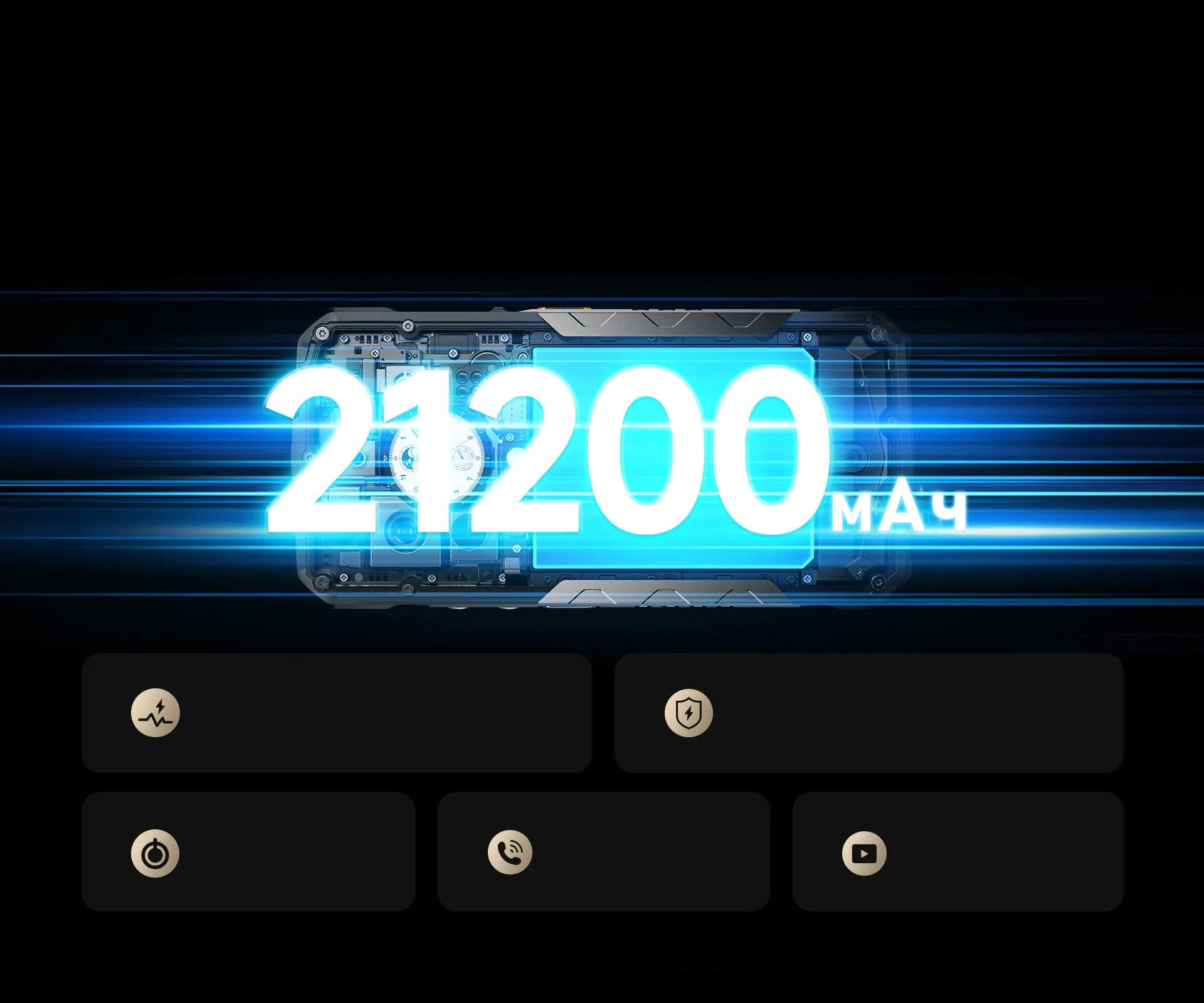 21. Рассчитанная ёмкость 10600 мАч при 7.74В, что эквивалентно ёмкости 21200 мАч. Данные об энергопотреблении получены в лаборатории Ulefone, фактические результаты могут отличаться.